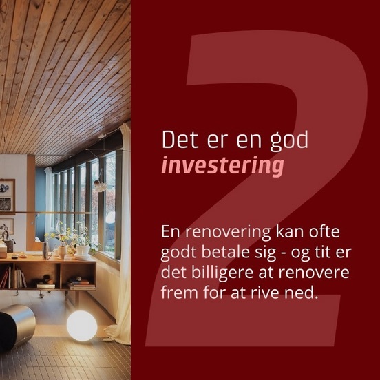 Teknologisk Institut, BUILD og Responsible Assets har med økonomisk bistand fra Forenet Kredit undersøgt og faktatjekket de myter, der oftest florerer. Det har vi gjort for at give jer, der er boligejere eller jer, der rådgiver boligejere, et bedre fundament for at træfe beslutninger eller rådgive om beslutninger, når I står med et hus, der enten skal reno-veres eller rives ned.